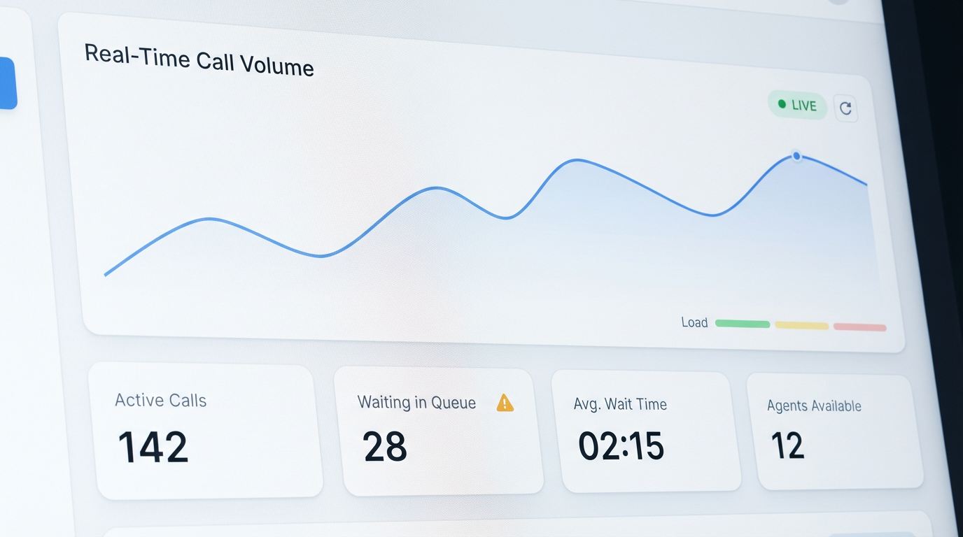 ממשק זמן אמת מספק תמונת מצב עדכנית על פעילות המוקד: שיחות פעילות, עומסים, זמני המתנה, זמינות נציגים ונתוני מערכת.